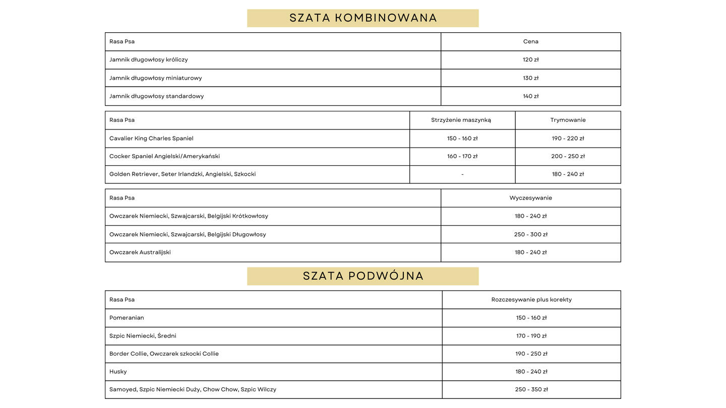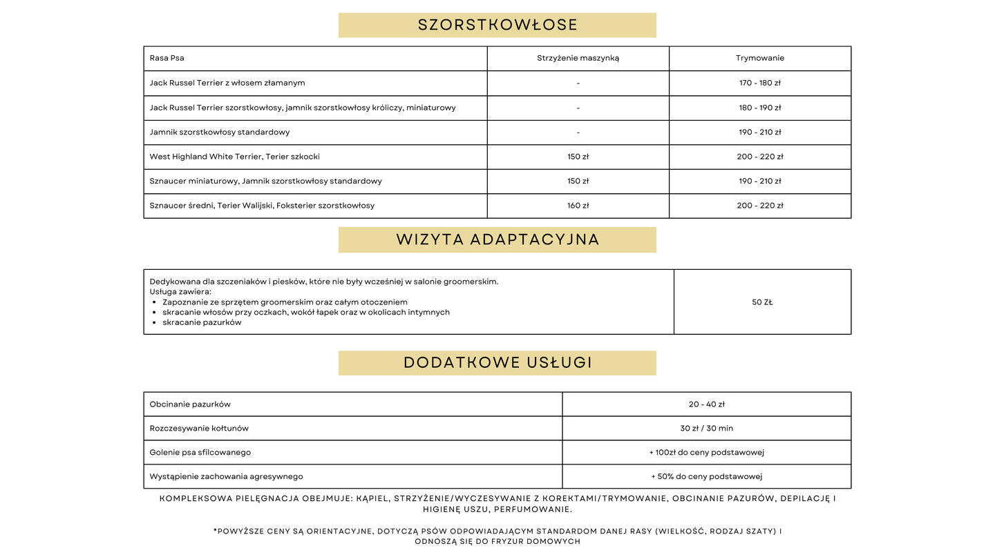 Brak odpowiedzi ze strony Klienta lub niemożność nawiązania kontaktu (np. gdy Klient nie odbiera telefonu lub nie odpisuje na SMS) w terminie 5 godz. od próby nawiązania kontaktu skutkuje to anulowaniem terminu wizyty.- Podczas pierwszej wizyty w salonie zakładana jest też tzw. Karta Klienta, w której zamieszczane są ważne informacje dotyczące psa jak m.in. imię psa, rasa, stanu zdrowia oraz szczepieniach. a także dane personalne Klienta, takie jak jego imię i nazwisko oraz nr tel. kontaktowego.- Obsługiwane są WYŁĄCZNIE PSY ZDROWE Z AKTUALNYM SZCZEPIENIEM PRZECIW WŚCIEKLIŹNIE. Podczas wizyty Klient powinien posiadać książeczkę zdrowia psa do wglądu dla groomera.- Suczki w trakcie cieczki nie są obsługiwane. Groomer ma prawo odmówić wykonania usługi, jeśli właściciel przyprowadzi suczkę z cieczką i pobrać opłatę za umówioną usługę.- Pies powinien mieć możliwość przed wizytą załatwienia swoich potrzeb fizjologicznych oraz nie powinien być świeżo po posiłku. Jest to ważne z uwagi na jego komfort.- Groomer ma prawo przerwać usługę na każdym jej etapie, jeśli pies nie pozwala na dalszą współpracę lub wykazuje zachowania agresywne i pobrać częściową lub pełną kwotę za usługę.- Jeśli pies cierpi na chorobę zakaźną, która może stanowić niebezpieczeństwo dla innych zdrowych psów (np. grzybica, świerzb itp.) skutkuje to odmową wykonania usługi.- Zdjęcia psa i/lub filmy z wizyty w salonie mogą zostać wykorzystane w celach promocyjnych.- W pracowni stylizacji podlega tylko jeden pies. Zapewniam ponadto, że psy nie są odurzane ani usypiane żadnymi środkami farmakologicznymi. Wobec psów nie jest stosowana przemoc.- Stanowisko pracy oraz sprzęt są dokładnie czyszczone i dezynfekowane przed każdym kolejnym zabiegiem pielęgnacyjnym. Sprzęt oraz środki do pielęgnacji są wysokiej jakości i są dedykowane do profesjonalnej pielęgnacji psów.- Pies jest grzeczniejszy gdy zostaje sam na sam z groomerem. Podyktowane jest to naszym doświadczeniem z którego wynika, że w większości przypadków obecność Klienta podczas zabiegów źle wpływa na zachowanie zwierząt albowiem pies nie chce współpracować z personelem a szuka kontaktu z właścicielem, co utrudnia tym samym przeprowadzenie zabiegów pielęgnacyjnych. Groomer dopuszcza obecność Klienta w trakcie wykonywania zabiegów pielęgnacyjnych jedynie wówczas gdy Groomer podejmie decyzję, że w danym wypadku obecność właściciela jest wskazana.- W razie niepełnej satysfakcji Klienta, gwarantuję przeprowadzenie darmowych poprawek (do 60 minut) w terminie do 3 dni roboczych po przeprowadzonym zabiegu pielęgnacyjnym.- Psy starsze i chore (np. na serce) są obsługiwane na odpowiedzialność właściciela. Klient oświadcza, że zdrowie psa może nagle się pogorszyć i nie będzie za to winą obarczać groomera.Pozostawiając zwierzaka pod opieką salonu HappiGroom, klient akceptuje wszystkie warunki regulaminu.